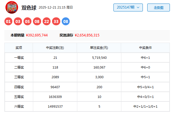 双色球25147期开奖,本期奖号红球01 03 05 08 22 33,蓝球08。当期红球号码大小比为2:4,三区比为4:1:1,奇偶比为4:2。形状方面,红球开出重号05。蓝球开出遗漏25期的偶数08。